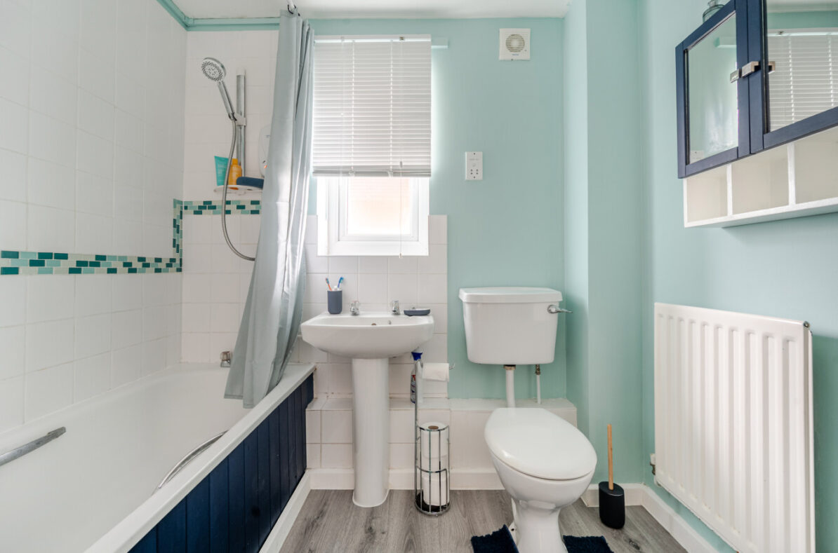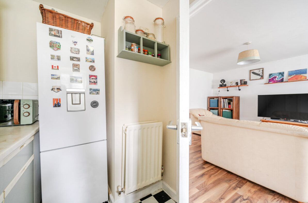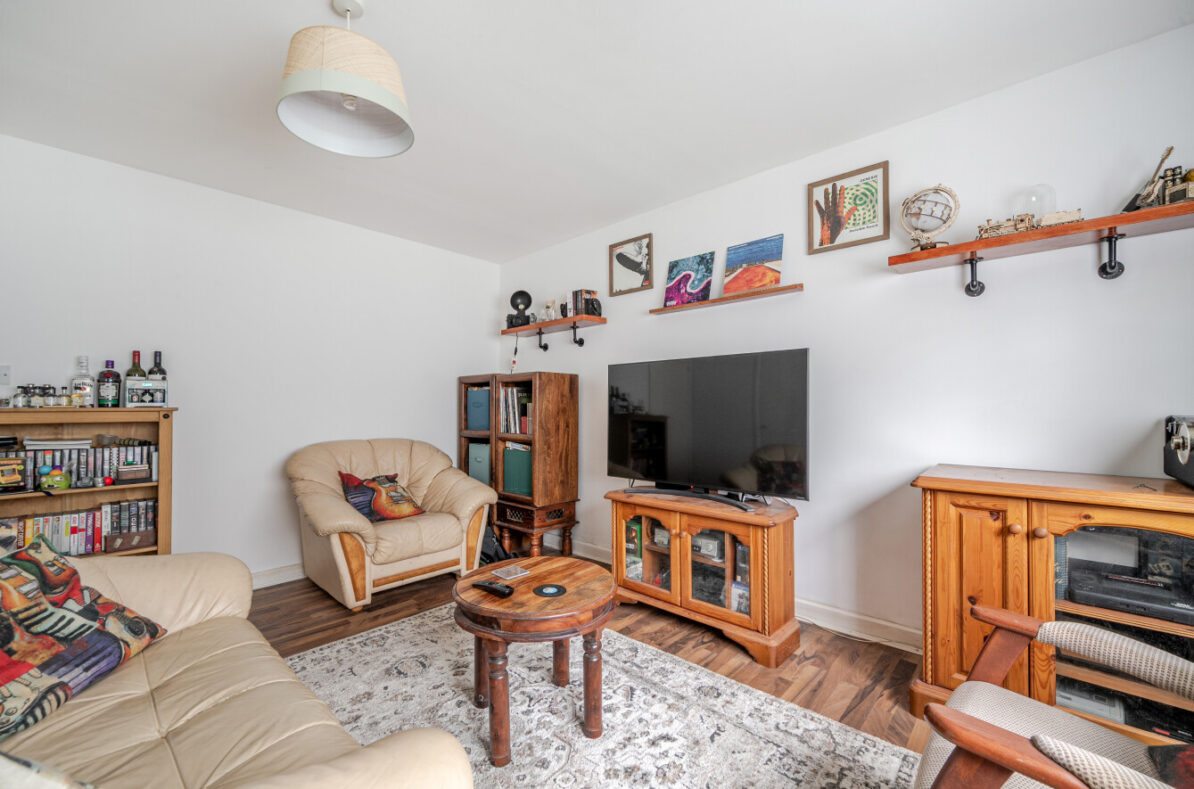 The separate fitted kitchen sits just off the living area and offers practical worktop space and storage, ideal for everyday cooking. The double bedroom is well proportioned, with room for wardrobes and additional furniture, while the bathroom features a full suite including bath with overhead shower.